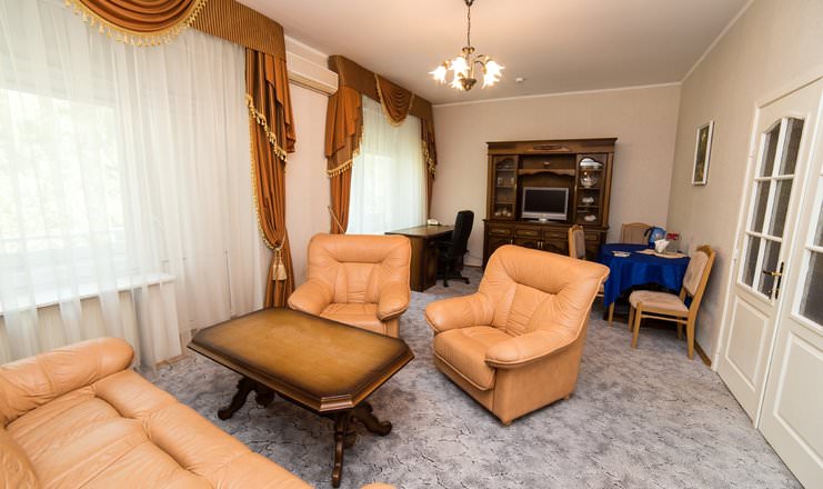 Двухкомнатный номер включает спальню с двухспальной кроватью, гостиную и мини-кухню.